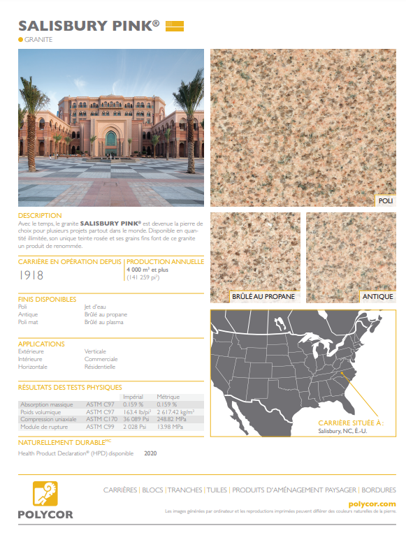 Vous envisagez utiliser le granite SALISBURY PINK®pour un projet commercial? Faire letour complet denotre siteWeb ouattendre laréponse de votre représentant chezPolycor n’est pas uneoption? Notrefiche technique est parfaite pourvous. Toutel’information technique nécessaire, enunseuldocument.