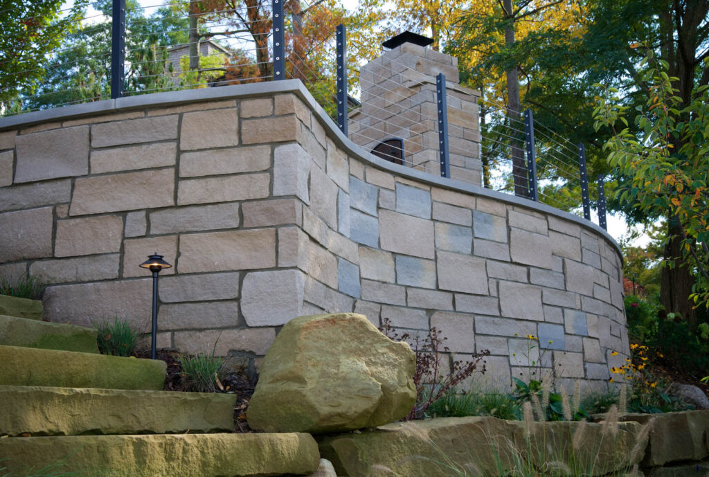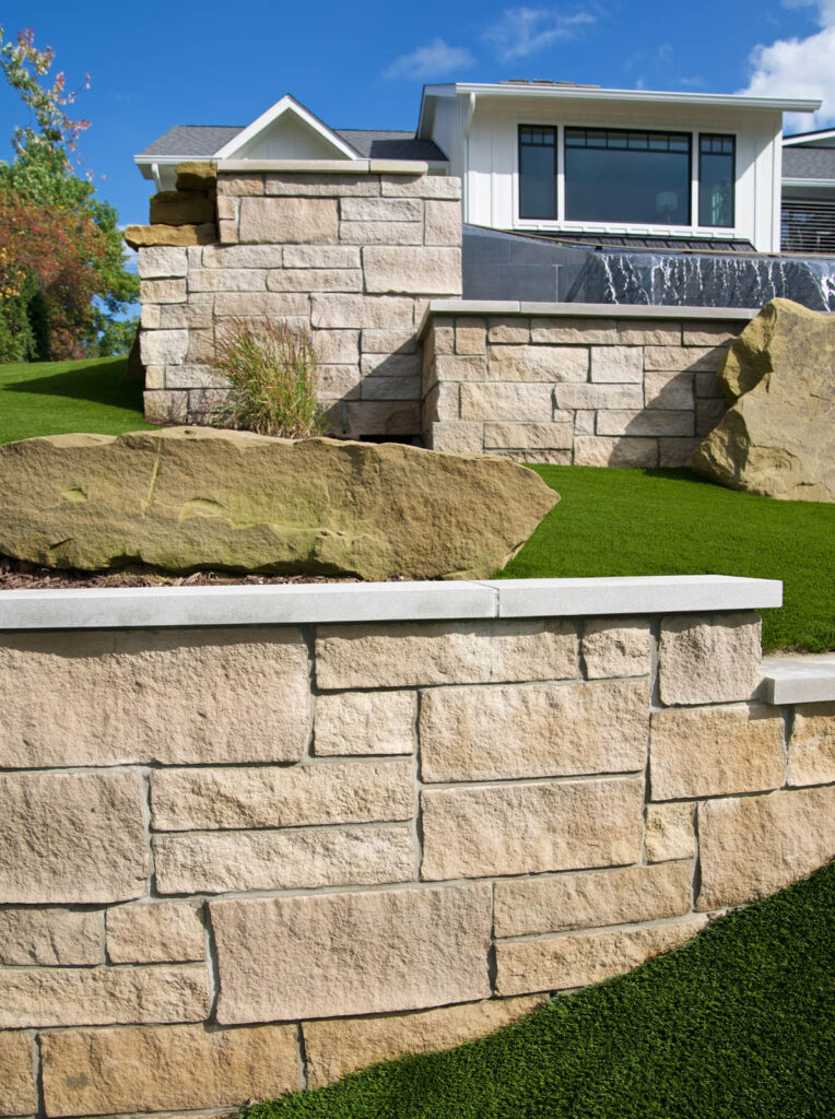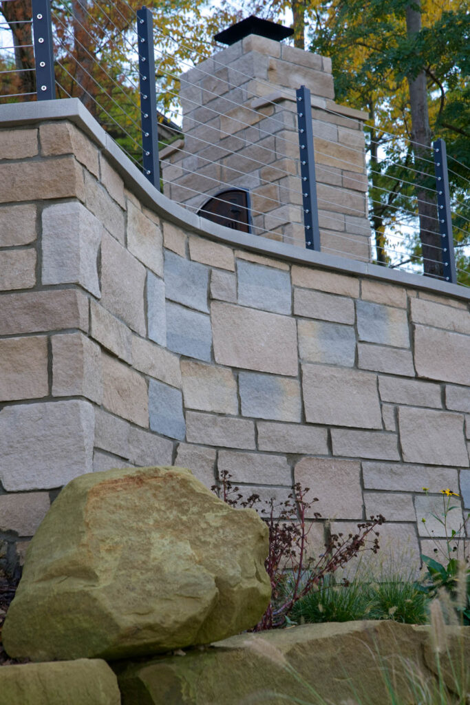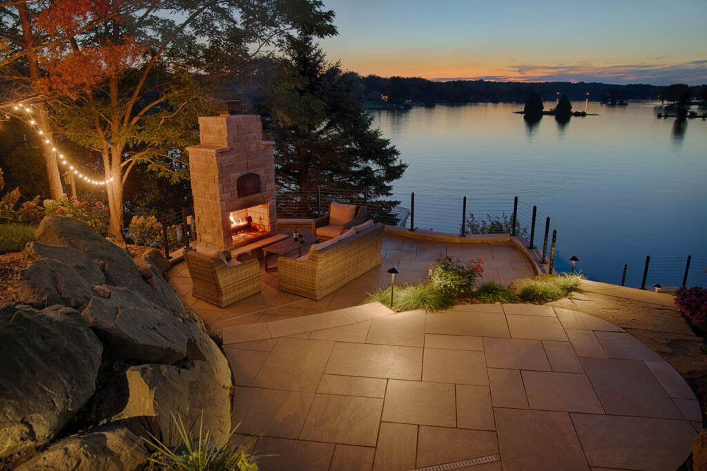 Nestled into the surrounding hills of Fenton Lake, this hardscape project features multiple outdoor living rooms that look as though they were carved into the rocky shoreline. From the large infinity edge pool patio and down a steep grade, landscape steps and pattern pavers, along with veneer-faced retaining walls and fireplace all bend seamlessly with the awe-inspiring surroundings. All the products are cut from Polycor Indiana Limestone – Full Color Blend.