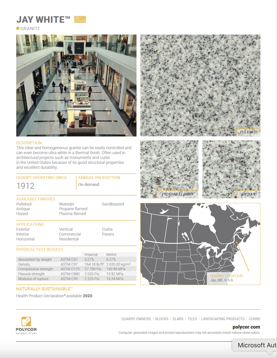You are considering specifying JAY WHITE™ granite for a commercial project? You don’t have time to look at every tab or waiting for your local Polycor Sales representative to reply to your email? Our Complete Product Spec Sheet is meant for you. Find all technical Information into one document for your Specification Process.